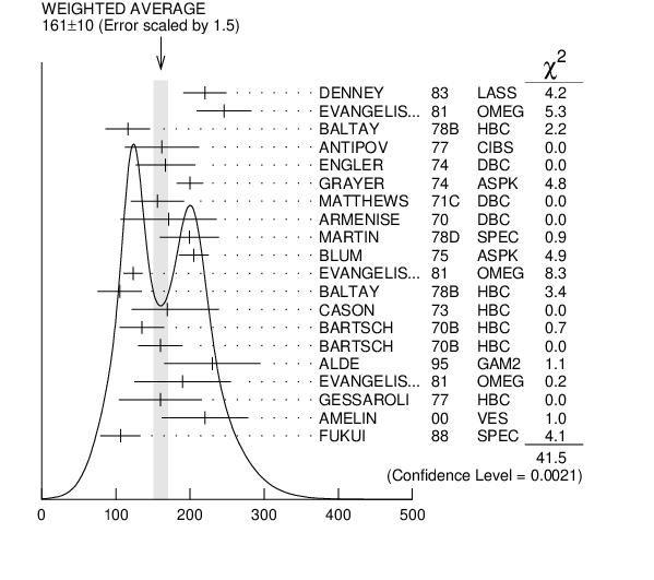 $\bf{ 161 \pm10}$ OUR AVERAGE includes data from 2${{\mathit \pi}}$ MODE, ${{\mathit K}}{{\overline{\mathit K}}}$ AND ${{\mathit K}}{{\overline{\mathit K}}}{{\mathit \pi}}$ MODES, (4${{\mathit \pi}}){}^{+-}$ MODE, ${{\mathit \omega}}{{\mathit \pi}}$ MODE, ${{\mathit \eta}}{{\mathit \pi}^{+}}{{\mathit \pi}^{-}}$ MODE  Error includes scale factor of 1.5.  See the ideogram below.